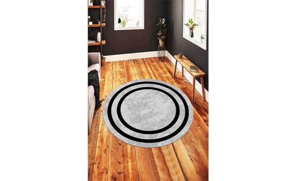 نقد و بررسی اجمالی فرش ماشینی دایره کلکسیون ورساچه کد 300100 زمینه طوسی