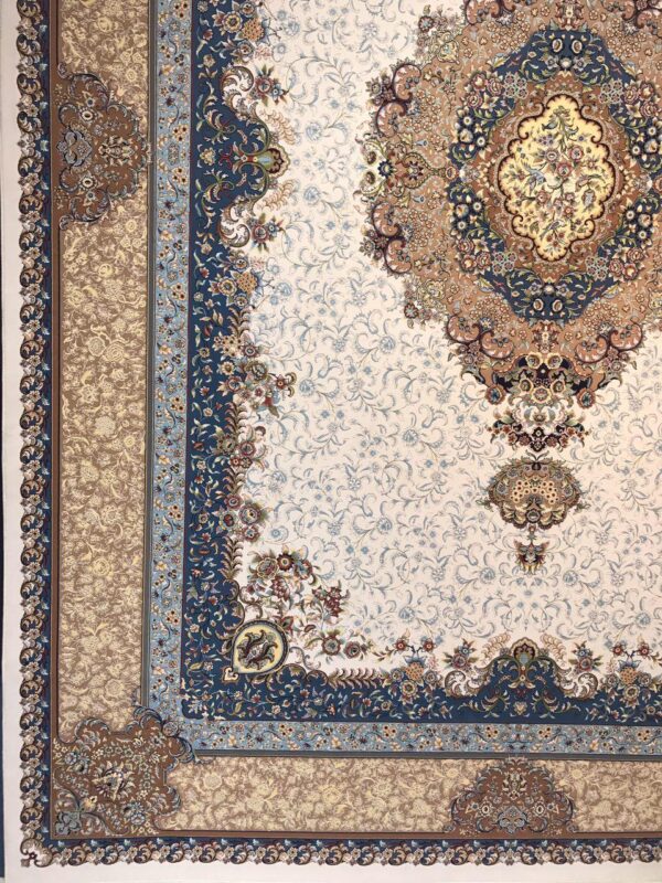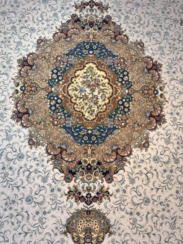 مشخصات فرش مشهد اردهال کد 101 کرم 1200 شانه تراکم 3600 گل برجسته
