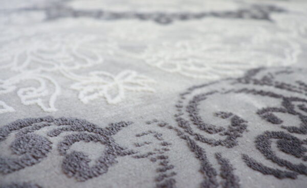 مشخصات فرش فانتزی کلکسیون کهنه نما کد 437 زمینه طوسی گل برجسته